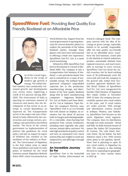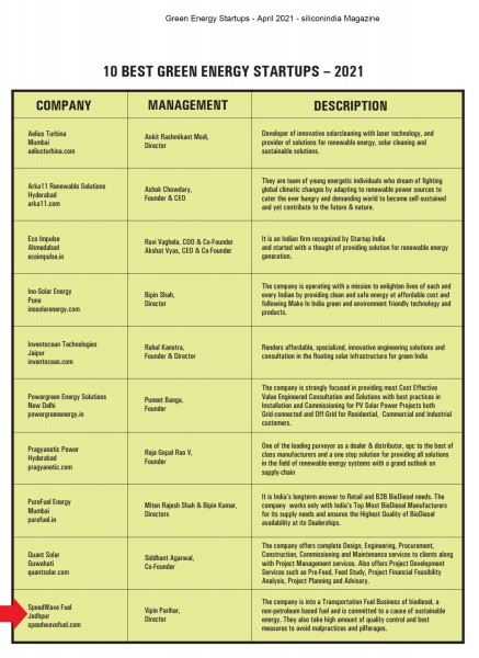 SPEEDWAVE FUEL - ARTICLE IN TOP 10 GREEN ENERGY INDIA STARTUP